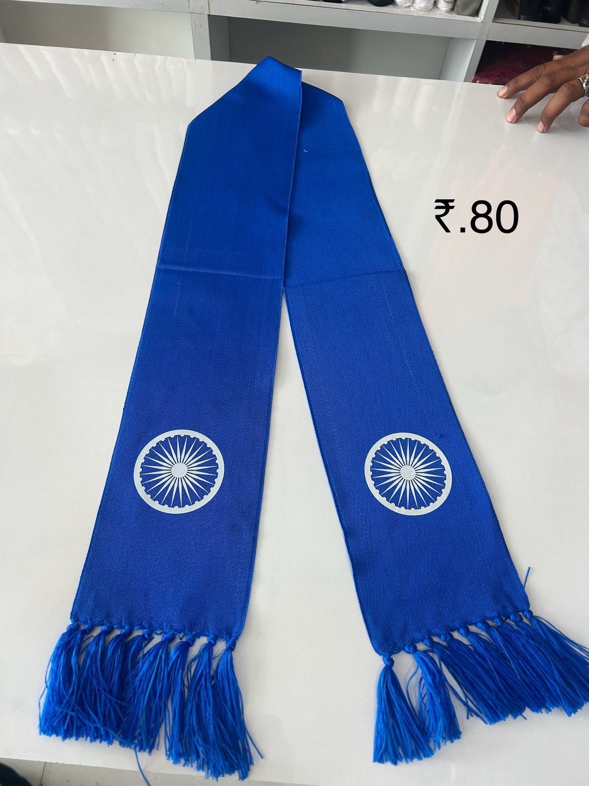 Plain blue fabric stole featuring Ashoka Chakra for cultural events.